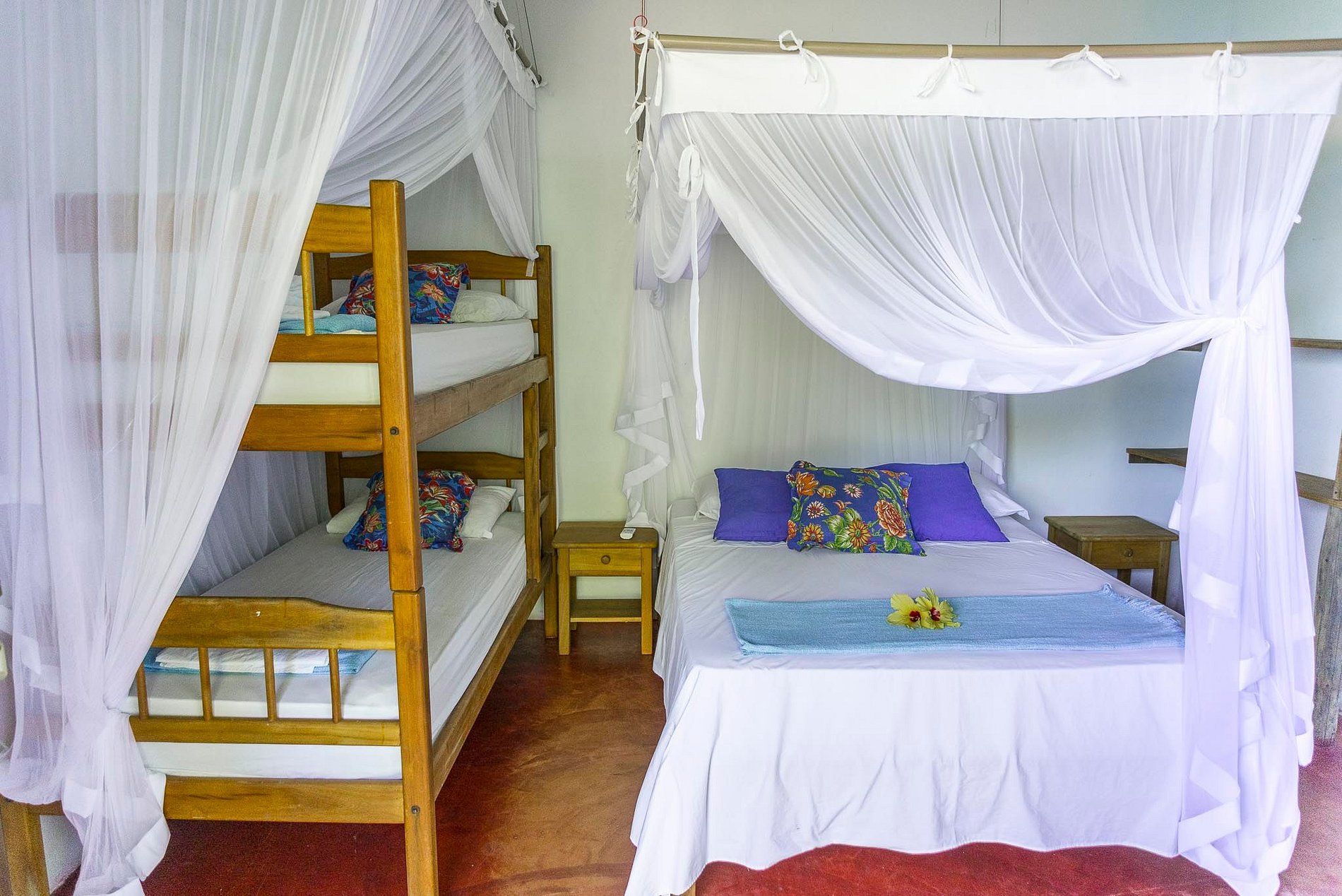 Quádrupla com ar condicionado (12.000 BTUs), frigobar, wi fi, ótimos colchões, lençóis de algodão, mantas, toalhas de banho, banheiro com chuveiro elétrico, e os hóspedes têm à disposição, uma cozinha montada de uso compartilhado.