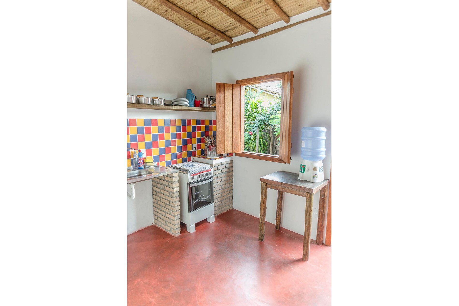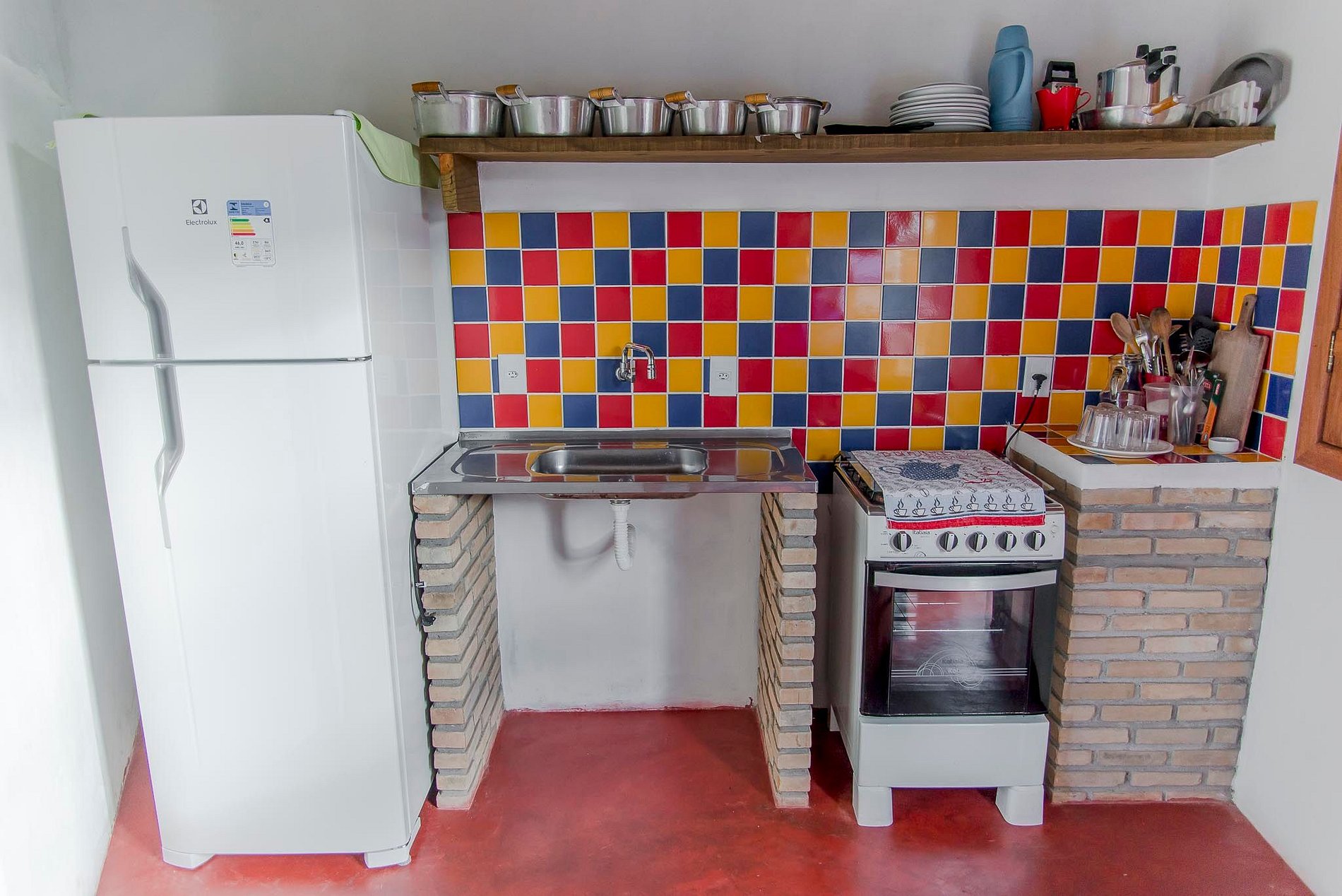 Cozinha montada, talheres, panelas, geladeira a gelo seco, fogão, mesa para jantar, pia em inox, utensílios.